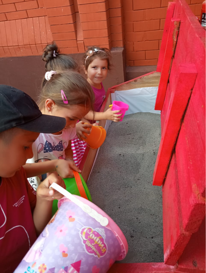 Наши детки помогают наполнять песочный ящик песком.